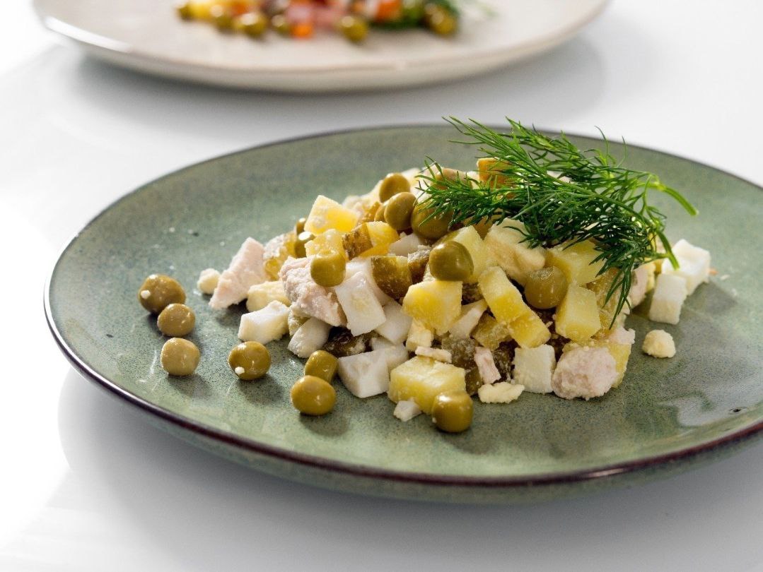 Куриное филе, отварные картофель, яйцо, соленый огурец, зеленый горошек, майонез