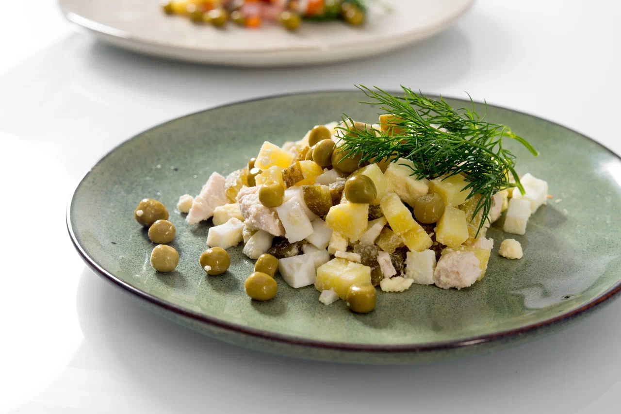 отварные куриное филе, яйцо, картофель, солёный огурец, консервированный зеленый горошек, майонез